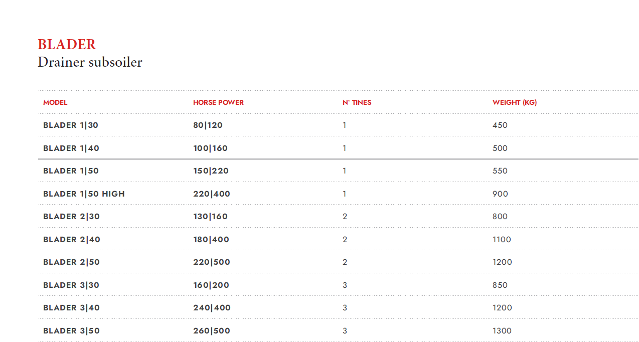 BLADER-ul este disponibil cu 1, 2 sau 3 dinți și poate lucra la adâncimi de la 60 la 130 cm. Toate modelele BLADER sunt echipate cu ancore si saboti din otel special anti-uzura HB400 si lame din otel calit. Pentru a facilita ridicarea utilajului la cap, BLADER este echipat cu un cilindru hidraulic pentru a extrage cu ușurință dințile din sol.